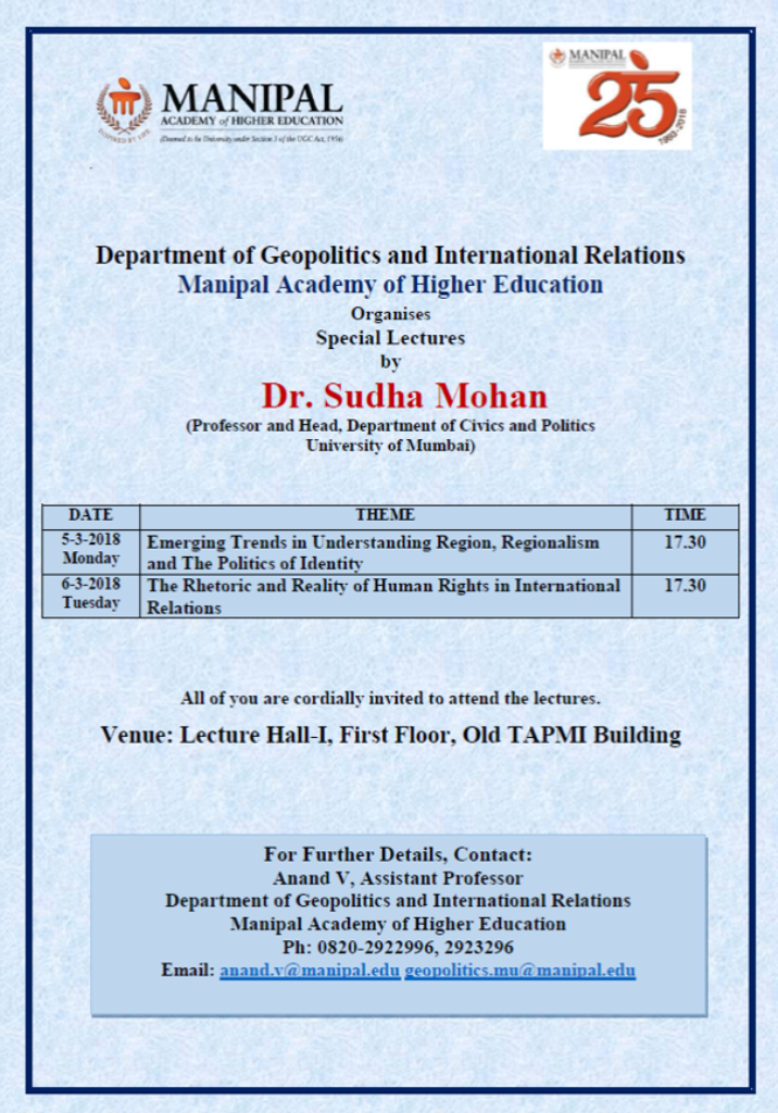 Prof. Sudha Mohan, Head of the Department of Civics and Politics, University of Mumbaidelivered special lectures at the department on pertinent themes of geopolitics and international relations.