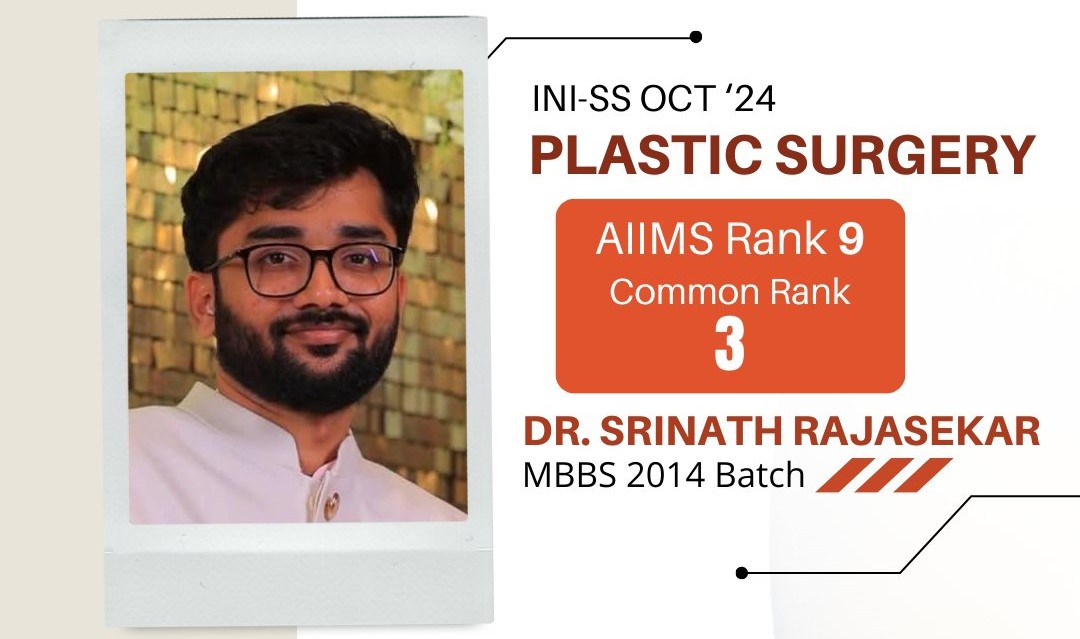 Congratulations to Dr. Srinath Rajasekar, MBBS Batch of 2014, KMC Mangalore, for his exceptional performance in the Institute of National Importance Super Speciality (INI-SS) 2024 exam for Plastic Surgery: