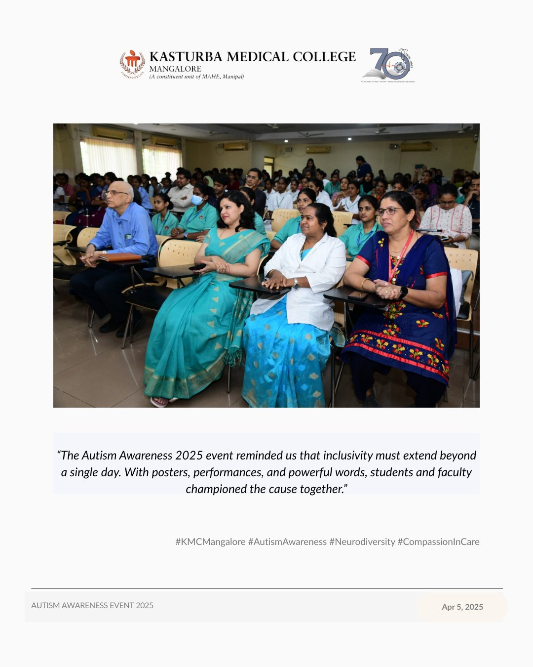 The Department of Pediatrics, KMC Mangalore, in collaboration with Government Wenlock Hospital, Indian Academy of Pediatrics—DK Branch, and Athena College of Nursing, hosted the Autism Awareness Event 2025 on April 5 at the Regional Advanced Pediatric Care Centre.