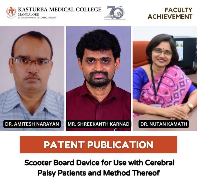 Congratulations to Dr. Amitesh Narayan (Professor of Physiotherapy), Mr. Shreekanth Karnad (Assistant Professor of Physiotherapy), and Dr. Nutan Kamath (Professor of Pediatrics) at Kasturba Medical College, Mangalore, for the publication of their patent titled "Scooter Board Device for Use with Cerebral Palsy Patients and Method Thereof" by the Indian Patent Office.
