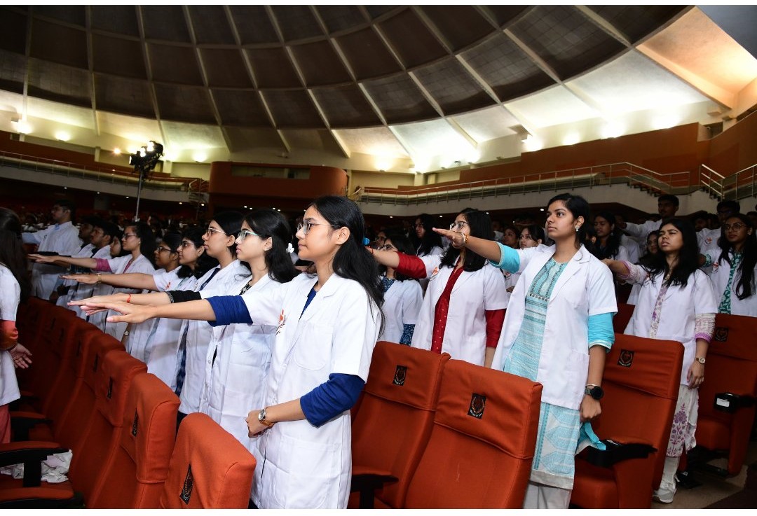Guest of Honor Dr. Kaushik Murali, an alumnus from the MBBS Batch of 1994, addressed the students and Chief Guest Dr. Dilip G. Naik provided inspiring remarks. The highlight of the event was the White Coat Donning Ceremony, symbolizing the students' official entry into the medical profession.
