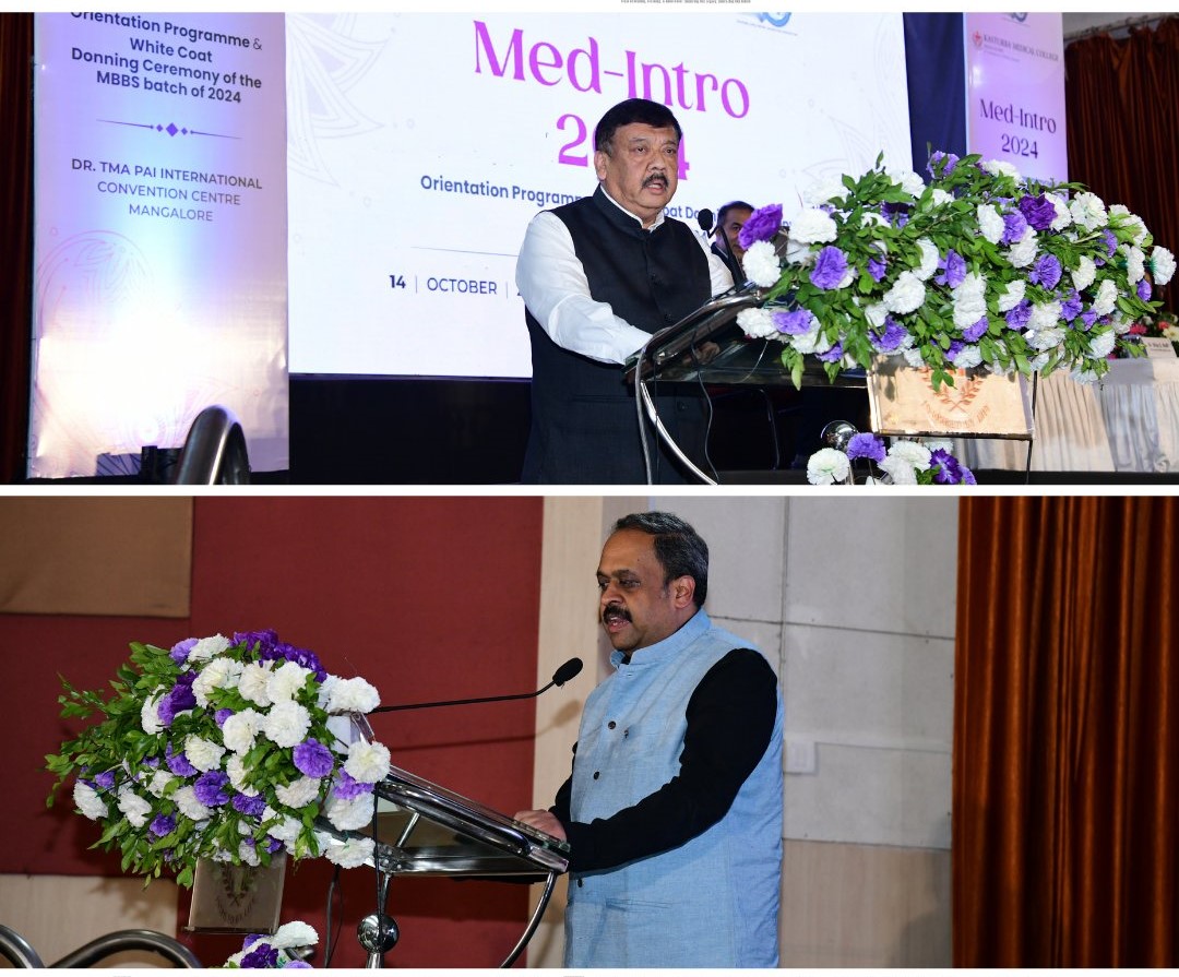 The Med-Intro 2024 event was held on October 14 at the Dr. T M A Pai International Convention Center, Mangalore, for the MBBS batch of 2024. The ceremony began with an invocation, lighting the lamp, and floral tributes to the founder, followed by a warm welcome and college overview by Dean Dr. B. Unnikrishnan.