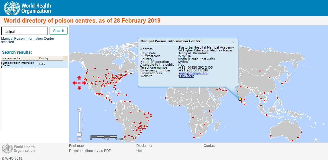 Manipal poison infermation center has been listed on the world map.