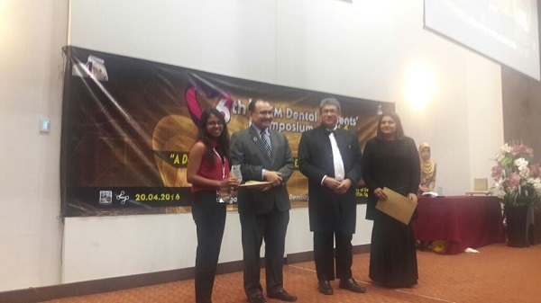 Miss Ansu Ann Abraham, III yr BDS won the 1st prize in paper presentation at the 6th UiTM Dental Students Symposium, hosted by Faculty of Dentistry, Universiti Teknologi Mara, Malaysia on 20th April, 2016