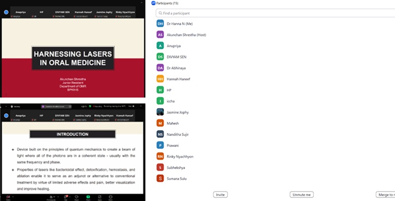 The last PACE meeting was held on 13th November 2024 at 6:00 PM, moderated by Dr. Iccha and attended by 15 participants. The session featured Dr. Ankuchan Shrestha as the presenter, who delivered an engaging lecture on the topic "Harnessing Lasers in Oral Medicine." Dr. Shrestha's presentation provided comprehensive insights into the principles of lasers, offering an overview of their functioning and detailed explanations of laser-tissue interaction. The session also explored the mechanism of pain relief with lasers, the classification and parameters of various laser types, and case discussions highlighting clinical applications of lasers in oral medicine and radiology (OMR). Additionally, the discussion balanced the advantages and disadvantages of using lasers in oral medicine, concluding with an emphasis on the importance of laser safety protocols. The session, which ended at 7:00 PM, underscored the potential of laser technology in enhancing clinical practice.