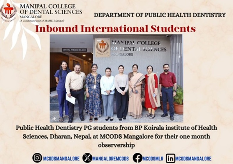 Dr. Suveksha Pandey and Dr. Urmila Paudel, final-year postgraduate students in Public Health Dentistry at B. P. Koirala Institute of Health Sciences (BPKIHS), Nepal, participated in a 28-day student exchange program at Manipal College of Dental Sciences, Mangalore, India, from September 18 to October 15, 2024. During their stay, they gained hands-on experience in search strategies, scoping reviews, and the use of Atlas.ti software. They visited both Bejai Urban and Surthkal Rural Primary Health Centres, observing their operations, and also toured the Community Health Centre in Moodabidri. Additionally, they attended and presented at the International Conference on Dental Education and Curriculum Conclave 6.0, delivered a journal club presentation to faculty and postgraduate students, and engaged in our post graduate presentations and some undergraduate theory classes. They closely observed the functioning of a mobile dental van as well. Their visit included a trip to the Manipal campus and excursions to Karkala and Kaup lighthouses to experience South Indian culture. They provided positive feedback, summarizing their experience: “We observed how the department operates and how it differs from our department at BPKIHS. We encountered new resources, such as the mobile dental van and portable dental unit, which are unavailable at our college. Overall, it was a wonderful learning experience for both of us.”