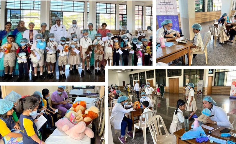 Kasturba Medical College, Mangalore initiated the ‘Teddy Bear Clinic’ School program in collaboration with the Department of Pediatric and Preventive Dentistry, Manipal College of Dental Sciences, Mangalore. This program was conducted for School children with teachers of St Aloysius Gonzaga , Mangalore. It was conducted to spread awareness of preventive health and dental issues. The Teddy Bear Clinic Programme aims to reduce anxiety in young children who have a fear of doctors, hospitals, and medical and dental procedures while enhancing their knowledge of health and diseases. Children aged 4-7 years got their favorite teddies to the clinic. As in the hospital setting, they registered their teddy names while presenting their complaints. Doctors demonstrated the clinical examination and showed usage of common instruments that will be normally used in the clinics like Mouth mirror, Explorer, stethoscopes, tongue depressors and otoscopes on the teddies. They were taken into the ambulance and shown the paraphernalia used for patient care. The programme was well appreciated by the children, and school authorities.