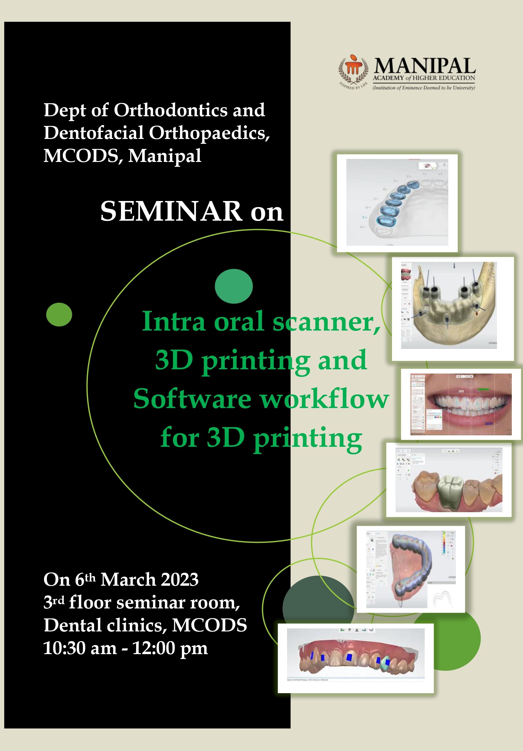 The Department of Orthodontics and Dentofacial Orthopaedics conducted a seminar on “Intraoral scanner, 3D printing and Software workflow for 3D printing” on 6 March 2023. The resource person was Mr. Iraimudi, Head of Healthcare, SR Technologies from 10:30 am-12 pm.