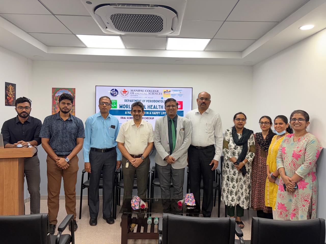 The Department of Periodontology, MCODS, Manipal, organized an oral health screening and treatment camp in observance of World Oral Health Day at Manipal Payment and Identity Solutions, Manipal, on March 25, 2026. The program was conducted under the leadership of Dr. Santhosh Kumar, Professor and Head of the Department, and Dr. Gopalakrishnan D, Dean, MCODS, Manipal. The initiative aimed to raise awareness about the importance of oral health and its impact on overall systemic well-being. The departmental team performed comprehensive clinical examinations, educated participants about their dental conditions and treatment needs, and emphasized the importance of maintaining good oral hygiene practices. A total of 158 individuals were screened, of whom 33 received appropriate treatment. This program orients with SDG goals 3, 4and 17.