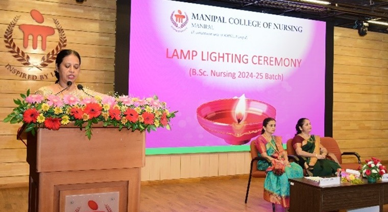 The lamp lighting ceremony for the 36th batch of BSc Nursing students at the Manipal College of Nursing (MCON) was held on October 15, 2024, with great enthusiasm and reverence. This significant event, symbolizing the students' formal entry into the nursing profession, was graced by the presence of esteemed guests, faculty members, students, and their families. The program commenced with a warm welcome by Dr. Savitha P., class coordinator, followed by a soulful invocation song led by Ms. Denna and her group, seeking divine blessings for the occasion. The dignitaries, including the Chief Guest, Dr. Thereza Mathias, Professor and HOD at Laxmi Memorial College of Nursing, Mangalore, were invited to the dais. Dr. Judith A. Noronha, Dean of MCON, and other distinguished guests were also present. In her inspiring address, Dr. Mathias emphasized the importance of nursing and the dedication essential for success in the profession.