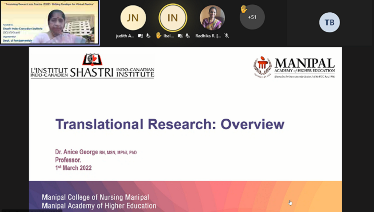 The Department of Fundamentals of Nursing, Manipal College of Nursing, Manipal Academy of Higher Education (MAHE), Manipal organized 5 days Virtual Lecture Series on “Translating Research into Practice (TRIP): Shifting Paradigm for Clinical Practice. This was funded by Shastri Indo-Canadian Institute (SCLS Grant)”. The inaugural program of this 5-day virtual lecture series was held on 1st March 2022 between 3.30 – 4.00 pm followed by the first-day session. Dr Prachi Kaul, Director, Shastri Indo-Canadian Institute, New Delhi, the Chief Guest for the programme addressed the participants during the inaugural program. The lecture series aimed to emphasize the efficient translation of research into clinical practice for the benefit of patient care by enhancing the knowledge on Translational Research its processes, models, challenges, and strategies.