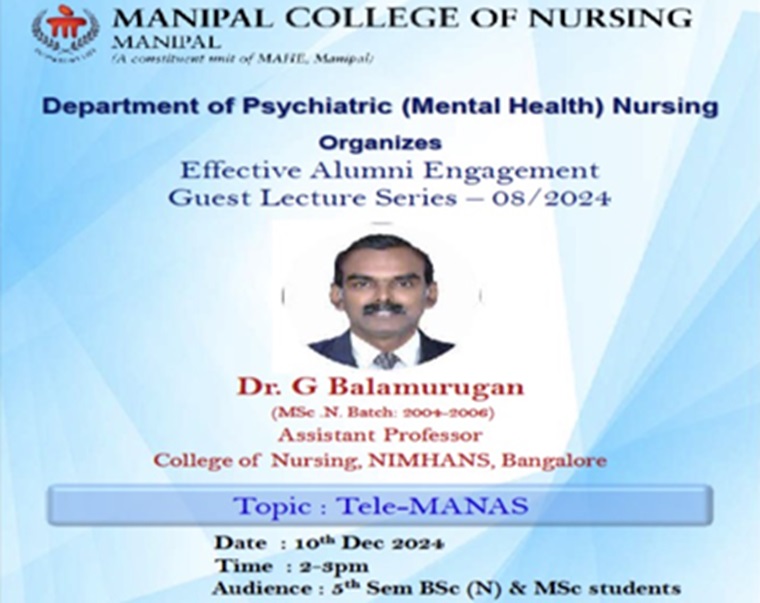 An alumni guest lecture was arranged by the Department of Psychiatric (Mental Health) Nursing, Manipal College of Nursing (MCON), MAHE, Manipal for the UG and PG nursing students on December 10, 2024 online mode. The resource person was Dr G Balamurugan, Assistant Professor, College of Nursing, NIMHANS, Bangalore.
