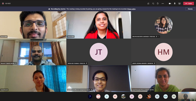Department of Medical-Surgical Nursing, Manipal College of Nursing Manipal has organized alumni guest lecture on the topic Conquer COVID: Tales of COVID-19 Warriors on 16 October 2020 between 3 pm to 4.30 pm. Mr. Jijomon (alumnus of MCON, MSc (N) 2012-2014 batch) Ms Maryl Cutinho (alumnus of MCON MSc (N) 2015-2017 batch), Ms. Roseminu Varghese (alumnus of MCON MSc (N) 2013-2015 batch), and Ms. Wilma Padmanabhan (alumnus of MCON MSc (N) 2013-2015 batch) were the resource persons for the session. They spoke about the COVID scenario in the United Kingdom, especially at their workplace. They shared their experience of managing COVID 19 patients, how they themselves suffered from the disease, the dilemma which they have faced, the fear and the uncertainties, the ways they adapted to come out of the situation etc. They highlighted the protocols which are being used during the COVID 19 epidemic across NHS foundations in the UK as well as their facility’s policies. The session was deliberated using Microsoft teams platform. A total of 124 participants including faculty members and students from 4th year BSc Nursing, 2nd-year PBBSc Nursing, 2nd year MSc Nursing and 2nd year Nurse Practitioner in Critical Care Residency programme attended the session. This program was coordinated by Mrs Janet Prameela D’Souza, Assistant Professor, Manipal College of Nursing Manipal, MAHE, Manipal.