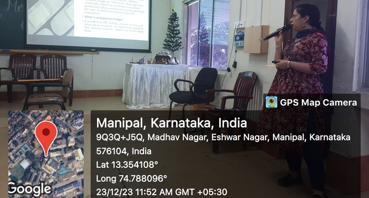 The Department of Obstetric and Gynecological Nursing, Manipal College of Nursing, MAHE, Manipal, organized a guest lecture titled "Triage in Antenatal Care" on November 23, 2023, between 11.30 a.m. and 12.30 p.m. The target audience was the fourth-year BSc Nursing students.