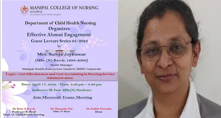 Department of Child Health Nursing, Manipal College of Nursing (MCON), Manipal Academy of Higher Education, Manipal organized an alumni guest lecture on “Cost Effectiveness and Cost Accounting in Nursing Service Administration” on April 17, 2023, between 02.00 pm & 03.00 pm for postgraduate nursing students through Microsoft Team Platform. Mrs. Saroja Jaykumar, Nurse Manager, Manipal Health Enterprises Limited (MHE). (MSc Graduate 1998-2000 batch) of MCON, Manipal was the speaker for the session. She discussed the various aspects of Cost Effectiveness and Cost Accounting in Nursing Service Administration including the types and the process of cost management in the nursing service department. She also emphasized the importance of nurses’ involvement in Cost management planning, which facilitates the empowerment of nurses in financial planning and management. Mrs. Saroja Jaykumar shared her experience of Cost management and emphasized the need for sound clinical experience for nurse administrators.