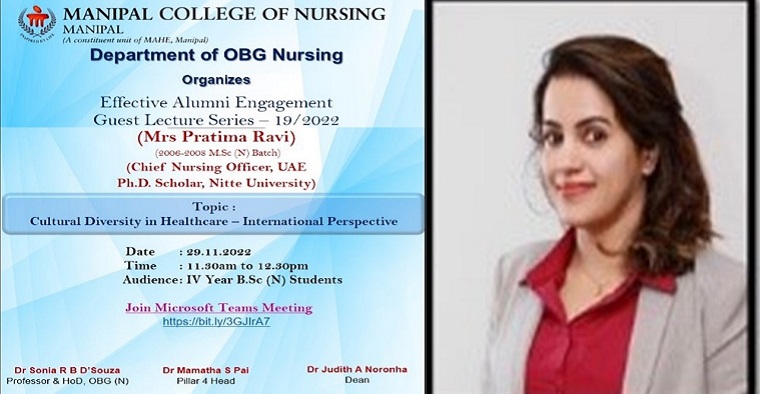 Department of OBG Nursing, Manipal College of Nursing, MAHE, Manipal has organized an Alumni guest lecture on the topic “Cultural Diversity in Healthcare –An International perspective” on 29th November 2022 between 11.30 am to 12.30 pm through MS Teams. Mrs.Pratima Ravi, Former CNO Thumbay Hospital Ajman, UAE & Research Scholar, NITTE University {MSc(N) 2006-2008 batch} discussed the role and responsibilities of an administrator. She shared her experiences of dealing with patients with diverse cultural differences and channeling their needs based on their requirements. She also highlighted how students need to understand this difference and work collaboratively with the healthcare team to bring out optimum health outcomes. A total of 95 participants including faculty members and students from IV year BSc Nursing attended the session.