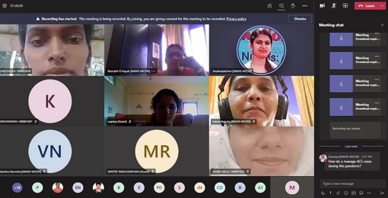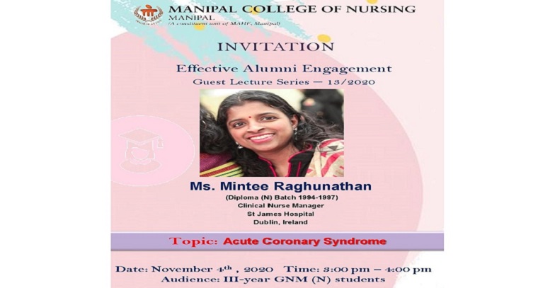 As part of effective alumni engagement, Manipal School of Nursing, MCON, MAHE organized a guest lecture on Acute Coronary Syndrome by Mrs Mintee Raghunathan, Clinical Nurse Manager, St. James Hospital, Dublin, Ireland on November 04, 2020 between 3.00 to 4.00 p.m through MS Team platform. A total of 92 participants including 77 diploma nursing students and 15 faculty members attending the session.