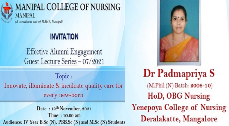 An alumni guest lecture was arranged by the Department of Obstetrics & Gynecological (OBG) Nursing, Manipal College of Nursing (MCON), MAHE, Manipal for the UG and PG nursing students on 19th November 2021 through blended mode. The resource person was Dr Padmapriya, Associate Professor and Head, Department of Obstetrics & Gynecological (OBG) Nursing, Yenepoya College of Nursing (Alumnus of MCON, MAHE, Manipal - MPhil 2008-2010 batch) deliberated a session on “Quality newborn care.” She emphasized on collaborative sessions between health care professionals for improving the maternity services and to develop confidence in managing perinatal services. Also, she highlighted on “POINTS” i.e. on pain management, optimal oxygenation infection control, nutrition and temperature management of all the newborns. A total of 50 participants attended the session (22 students attended offline and 28 participants attended online through MS teams).
