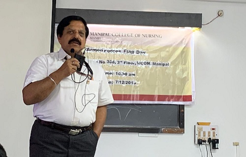 On the occasion of Indian Armed Forces Flag Day, Air Commodore Harindra Kumar Dhiman, Chief Warden of Health Sciences Hostels at MAHE took a session to students and staff of Manipal College of Nursing Manipal on December 7, 2019.
