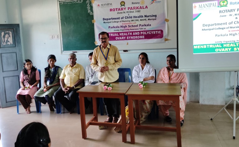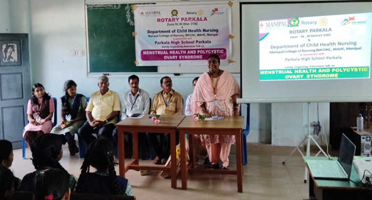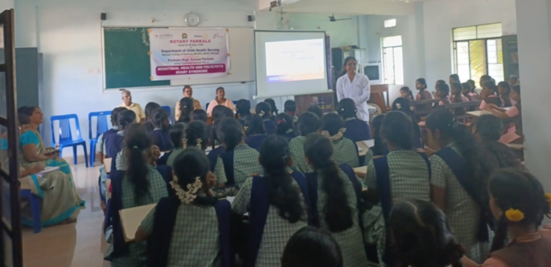 The Department of Child Health (Paediatric) Nursing, Manipal College of Nursing (MCON), Manipal Academy of Higher Education (MAHE), Manipal, in collaboration with Rotary Club, Parkala, hosted an awareness talk on “Menstrual Health and Polycystic Ovary Syndrome (PCOS) at Parkala High School, Parkala, Udupi District, Karnataka, on 1st October 2024, between 2.00 p.m. and 4:00 p.m in recognition of PCOS awareness month. The session aimed at raising awareness among high school students and faculty members on the significance of maintaining menstrual health for promoting health and preventing illness in the future.