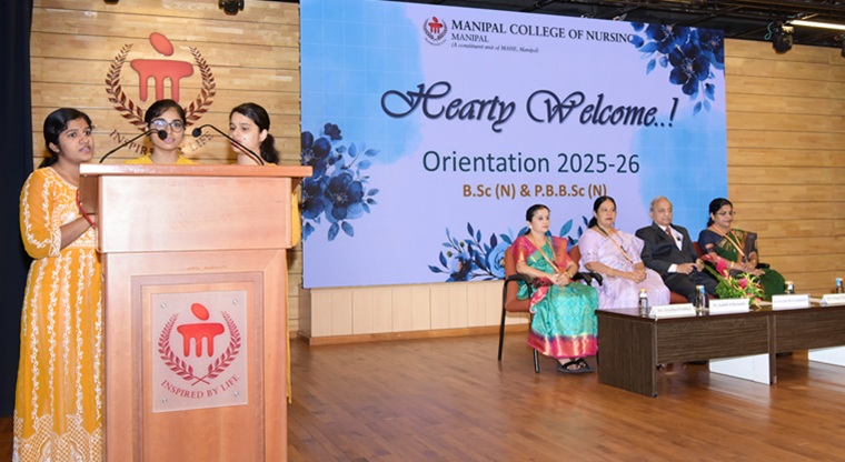 The orientation program for BSc and PBBSc Nursing students was conducted on August 1, 2025, at T.M.A Pai Hall. The program commenced with an invocation by Ms. Sreelakshmi and her team from the BSc Nursing cohort, setting a serene tone for the event.