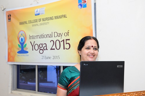 Dr.Manjari Chandra, ex-student of Yoga therapy, KMC Manipal had demonstrated various yoga aasanas. Students and faculty of MCON and MSON joined her and performed various aasanas. The various aasanas demonstrated were: Trikonasana, Parshwakonasana, Parshwottanasana, Padahastasana, Paschimatanasana, Janurshirshasana, Bhujangasana, Dhanurasana, Bharadwajasana, Ardhamatsyendrasana, Sarvangasana, Vrikshasana, Baddakonasana, Anuloma Viloma Pranayama, Makarasana and Shavasana.