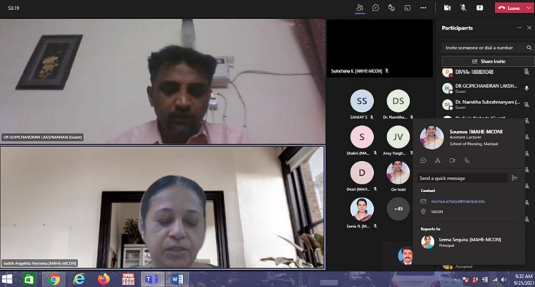 The day commenced with a welcome address and introduction of the keynote speaker by Dr Judith A Noronha, Dean, MCON, MAHE, Manipal. The keynote address on the theme - Intervention Research in Nursing Practice was delivered by Dr L Gopichandran, Associate Professor, College of Nursing, AIIMS, New Delhi. He emphasized the importance of nurses being empowered to conduct research and generate evidence to improve the quality of care as well as their professional development. Following which the participants presented their research work through the poster presentation virtually. In the afternoon innovative ideas were presented by the participants. The program concluded with the closing remarks by Dr Anice George, former Dean, MCON, Manipal, where she highlighted the need for research in nursing. The winners of the best e-posters and innovative ideas presentations were announced. The participants expressed that such events should be conducted more often as they provide a platform for knowledge enhancement and also help improve the quality of nursing care.