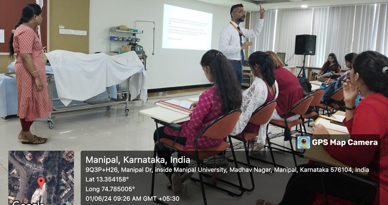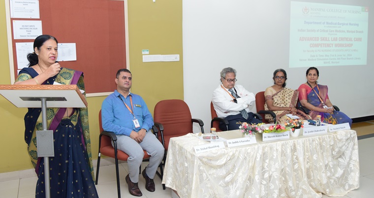 The Department of Medical-Surgical Nursing, Manipal College of Nursing (MCON), Manipal Academy of Higher Education (MAHE), in collaboration with the Indian Society of Critical Care Medicine, Manipal branch, organized a two-day “Advanced Skill Lab Critical Care Competency Workshop” for faculty and PG Nursing students (NPCC & MSc) on May 31 & June 1, 2024, at the Medical Simulation Centre, 6th floor Search Library, MAHE Manipal. The workshop began with a formal inaugural program at 9:00 on May 31st, and Dr Sharath Kumar Rao K, Pro Vice Chancellor-Health Sciences MAHE, Manipal, was the chief guest. He delivered an inspiring speech highlighting the role of interdisciplinary collaboration in advancing health sciences, emphasizing the importance of such workshops and the need for upskilling competencies. Dr Jyothi Chakrabarty, Professor & Head, Department of Medical Surgical Nursing, MCON Manipal, welcomed the gathering. Dr Judith A Noronha, Dean, MCON Manipal, also delivered a compelling speech on the vital role of nursing in healthcare, emphasizing the need for ongoing education and compassionate patient care to meet the evolving challenges in the field. Dr Vishal Shanbhag, Associate Professor, Department of Critical Care Medicine, KMC Manipal, provided an overview of the workshop.