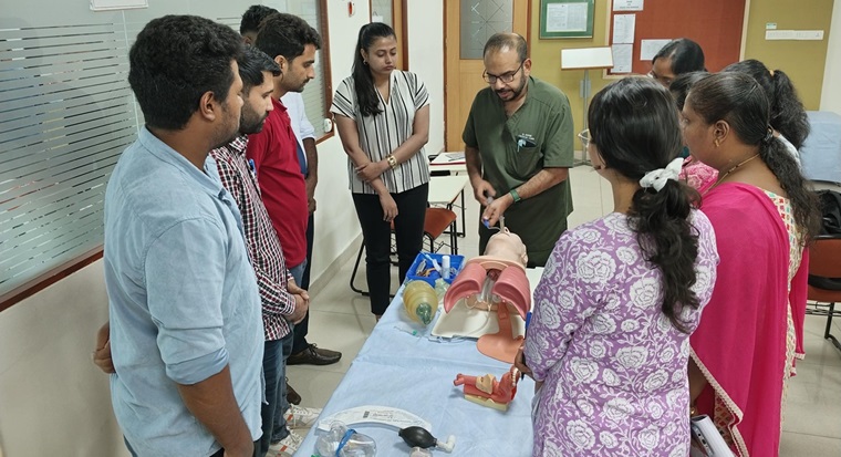 The two-day workshop began with a session on airway assessment and management by Dr Souvik Chaudhuri, Associate Professor, Dept. of Critical Care Medicine, KMC Manipal, followed by ABG interpretation by Dr Shwethapriya R., Professor, Department of Critical Care Medicine, KMC, Manipal. Dr Sagar M S Associate Professor Department of Critical Care Medicine, KMC, Manipal, took an engaging session on central line insertion. An interactive session on Advanced Cardiac Life Support was delivered by Dr. Daisy J Lobo, Associate Professor, MCON Manipal. Four skill training stations, named ABG interpretation, central line insertion, airway assessment and management, and advanced cardiac life support, were conducted in the afternoon, where participants were allowed to have hands-on experience practising the skills under the expert supervision of resource personnel.