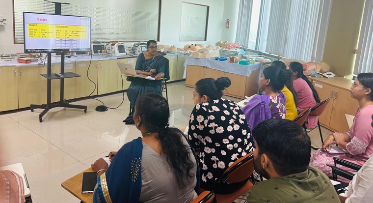 The second day’s session began with Dr. Vimal Krishnan, Additional Professor, Department of Emergency Medicine, KMC Manipal, on the topic of trauma assessment. He led an engaging and dynamic session, seamlessly integrating theoretical concepts with practical, scenario-based learning. Ms. Teena Sharon, Nurse Practitioner in Critical Care, Kasturba Hospital, Manipal, presented a detailed session on organ transplantation, including the medical procedures, ethical considerations and patient care. A session on POCUS for shock was presented by Dr. Vishal Shanbhag, Associate Professor, Department of Critical Care Medicine, KMC Manipal, with several real-life examples suggesting that it provides valuable knowledge and practical insights into using ultrasound technology to diagnose and manage shock effectively. Another experiential session on ICD insertion was done by him to enhance the skills of the participants. In the afternoon, workstations on ultrasound simulation, ECG interpretation, drug calculation, and chest x-ray interpretation were conducted by Dr Vishal Shanbhag, Associate Professor, Department of Critical Care Medicine, KMC Manipal, Dr Melita Sheilini, Associate Professor, MCON Manipal, Dr. Soumya Christabel, Assistant Professor (Sr scale), MCON Manipal; and Dr. Shalini G. Nayak, Assistant Professor (Sr scale), MCON Manipal, respectively.