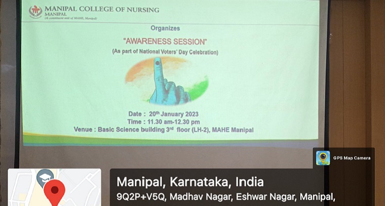 As part of National Voters’ Day, Manipal College of Nursing Manipal organized an awareness session on the topic on 20th January 2023 from 11:30 am to 12:30 pm in the Basic Science building, 3rd floor, LH2, MAHE Manipal.