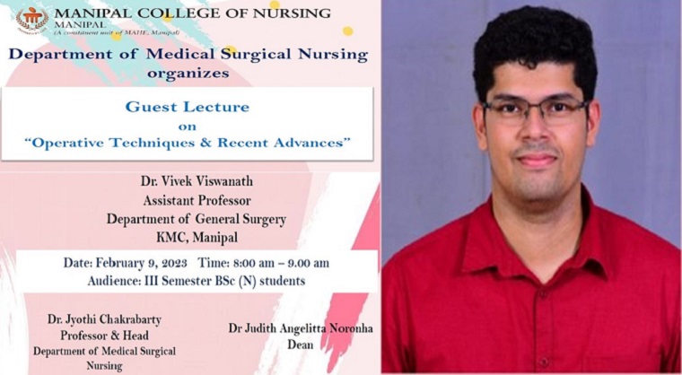 Department of Medical-Surgical Nursing of Manipal College of Nursing Manipal has organized a Guest Lecture on the topic "Operative Techniques and Recent Advances” on 9th February 2023 between 8:00 am & 9:00 am. Dr. Vivek Viswanath, Assistant Professor, Department of General Surgery, Kasturba Medical College, MAHE, Manipal was the resource person. He spoke about the basic surgical techniques, operative suites, and the common surgeries performed in the area of General Surgery. He also highlighted the newer technologies that are in use and the advantages of these technologies in the surgical area.