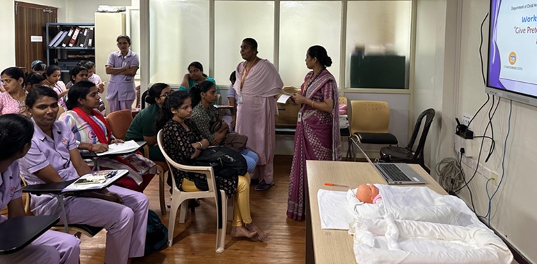 Dr. Sheila Samanta Mathai, Professor & Head, Department of Neonatology, KMC, Manipal, provided a brief overview of the program and highlighted the importance of the theme. An interactive question and answer session was organized for the semester V BSc Nursing students, MSc Nursing students of MCON, MAHE, Manipal, and staff nurses from the neonatal, antenatal, and postnatal units of Kasturba Hospital, Manipal, to strengthen their knowledge of essential newborn care practices. Dr. Subhodh Shetty, Associate Professor, Department of Neonatology, KMC, Manipal, was the resource person. A total of 20 students and 26 staff nurses demonstrated enthusiasm and actively participated in the discussion. Following this, a comprehensive newborn care workshop on the theme was conducted by the team of staff nurses. The nurses demonstrated key newborn care practices to enhance their knowledge and practical skills related to newborn care. The first session focused on Developmental Supportive Care, with its components of Kangaroo Mother Care and nesting, demonstrated by Ms. Pramila, Ms Rakshitha, Ms Dakshayini, and Ms Anushka. The second session was aseptic non-touch technique (ANTT) by Ms Sudharshini, Ms. Chaithanya, and Ms, Ann Mary. They demonstrated the proper techniques for hand washing, intravenous hub management, and preparation of intravenous fluids and total parenteral nutrition under laminar airflow (LAF) conditions. The last session of the workshop focused on assessment and the positions of breastfeeding, paladai, and katori feeding by Ms. Shashikala, Ms Ashwini, and Ms Susanna.