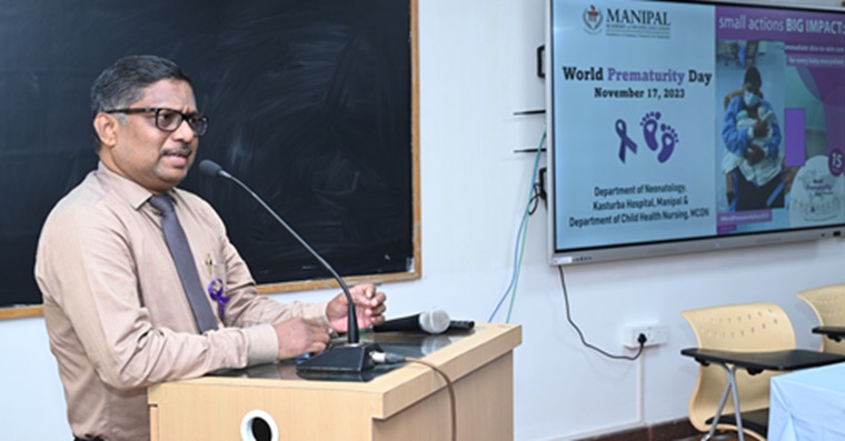 The Chief Guest of the Program, Dr Avinash Shetty, Medical Superintendent of Kasturba Hospital Manipal, in his address, highlighted that the incidence of prematurity in Udupi District is comparatively less due the maternal and child health care provided in KH. He appreciated Dr. Diwakar and Dr Leslie E Lewis, former HODs, Department of Neonatology, KH, for the significant contribution and service in the growth of NICU in the last two decades. He acknowledged V Adm (Retd)Dr Sheila S Mathai for taking up the leadership in developing the neonatology department and the new initiative of developing the ‘Human Milk Banking’. He said that the cost of care in NICU is high, and Kasturba Hospital is supporting the parents in this regard, by giving concessions and exploring the funding sources. He complimented the NICU nurses for the commitment to nursing care of newborns and congratulated Department of Neonatology and MCON for organizing the World Prematurity Day.