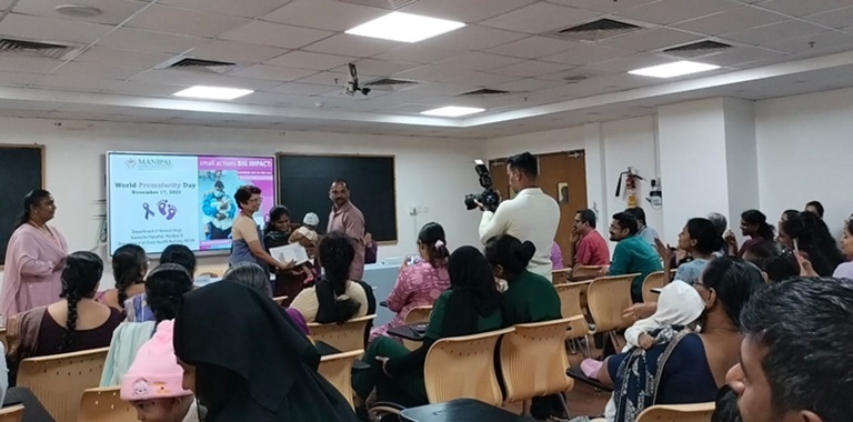 The Department of Neonatology, Kasturba Hospital, Manipal (KH) and Department of Child Health Nursing, Manipal College of Nursing, Manipal (MCON) observed the World Prematurity Day on 17 November 2023 with various activities. The theme for this year is “Small Actions BIG IMPACT: Immediate skin to skin care for every baby everywhere”. The aim was to create awareness about the care of preterm babies and celebrate the lives of premature babies and to honour the health care workers especially the nurses for the tireless efforts in providing excellent care to the premature babies.