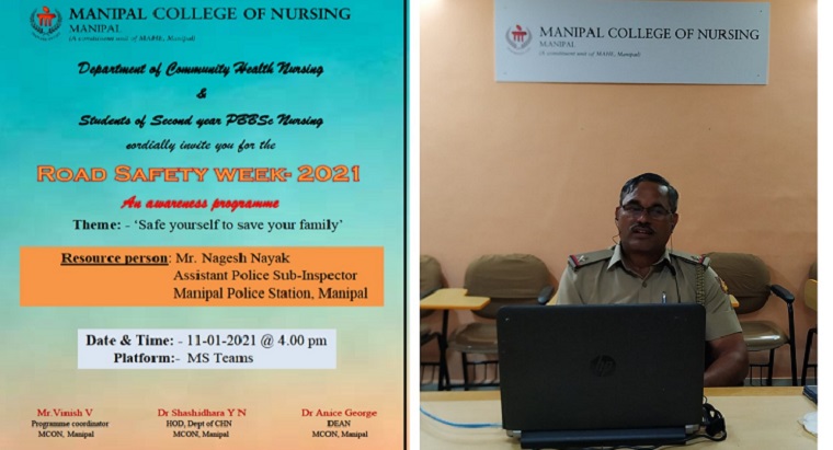 Community Health Nursing department along with PBBSc Nursing students observed National Road Safety week on January 11, 2021, from 4 pm to 5 pm through MS Teams online platform on the theme “Safe yourself to save your family”. Mr Nagesh Nayak, Assistant Police Sub-Inspector, Manipal Police Station, Manipal gave a brief talk on the importance of observing Road Safety week. The students of II PBBSc Nursing conducted a presentation on different types of traffic signals. On January 14, 2021, a Radio awareness programme for the public was conducted and the programme broadcasted by Community radio, Manipal at FM 90.4 on January 14, 2021, from 6.15 pm onwards. Programmes were guided and supported by Mr Vinish V, Assistant Professor, Department of Community Health Nursing, MCON, MAHE, Manipal.