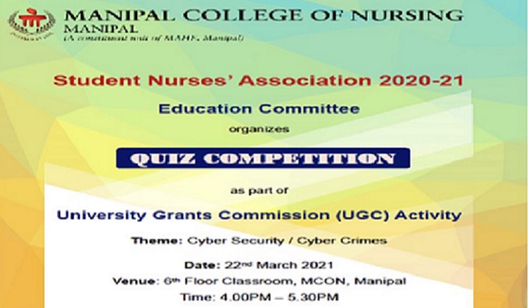 The Education Committee of Student Nurses’ Association 2020 -21 of Manipal College of Nursing Manipal has organized a quiz competition as part of the University Grants Commission (UGC) activity on 22nd March 2021 between 4:00 & 5.30 pm. The theme for the quiz competition was “Cyber Security/ Cyber Crimes”. There were four teams with two participants in each team. The programme was coordinated by SNA Education Committee 2020-21. A total of 15 students participated in the event.