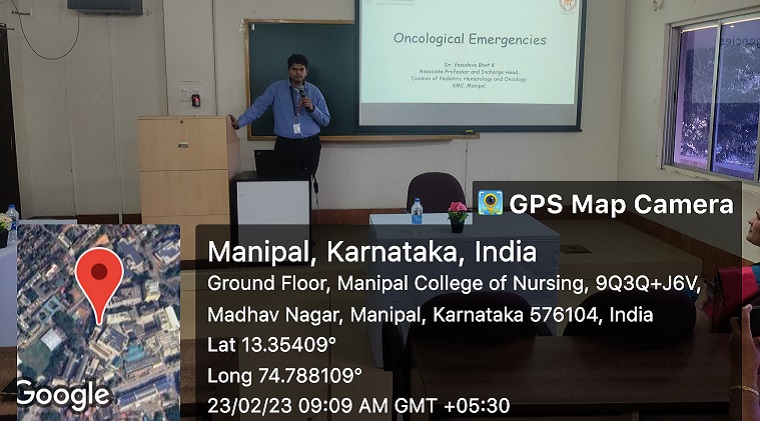 Department of child health nursing, Manipal College of Nursing (MCON), Manipal Academy of Higher Education(MAHE) Manipal organized a seminar on “Childhood Cancer” in association with a division of Pediatric Hematology and Oncology, KMC, Manipal, as part of International Childhood Cancer Day on the theme: “Better survival #through your hands” on 23rd February 2023 between 9 am and 1.00 pm. The resource person for the seminar, Dr. Vasudeva Bhat K, Associate professor, Department of Pediatric hemato oncology (PHO), KMC, Manipal, explained the four major pediatric oncological emergencies, ie. Tumor Lysis Syndrome, Leukocytosis, Febrile neutropenia, and Spinal cord compression. He also emphasized that better care is possible only by teamwork from trained multidisciplinary members, and nurses have a significant role in this. Dr. Archana MV, Assistant professor, Department of PHO, KMC, Manipal, shared the dos and don’ts while giving care to a child with a central line. She briefed on common types of central lines, insertion and maintenance, and the nurse's role in the prevention of central line-associated bloodstream infection. Dr.Anjalin Dsouza, Assistant Professor, department of child health nursing, MCON, MAHE, Manipal, discussed the care bundles on pediatric chemotherapy. Dr. Mamatha S Pai, professor Dept of child health nursing, MCON, Manipal, shared the recent research on evidence-based supportive care practices in childhood cancer. She also highlighted the importance of following clinical Protocols.