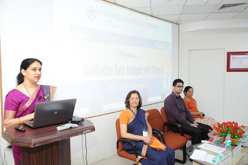 The objective of the workshop was to get orientation & hands on experience on NVivo-11 software for the qualitative data analysis. The inauguration of the workshop was held at 8.30 am on May 23, 2017. Dr. Keerthilatha M Pai, Dean, MCODS Manipal, MU, was the Chief Guest for the inaugural function. Dr. Anice George, Dean, Manipal College of Nursing, Manipal, Dr. Sanjay Singh, Research Officer, Heurexler Research Pvt, New Delhi, Dr. Baby S Nayak, Organizing Secretary, were present during the inaugural function. Dr. Baby S Nayak in her welcome address introduced the chief guest and the resource person. In the inaugural address, Dr. Keerthilatha M Pai emphasised on the importance of research in our profession and congratulated the Dean and the faculty of MCON for organizing this workshop. Dr. Sanjay Singh, the resource person for the day, gave an overview of the workshop.