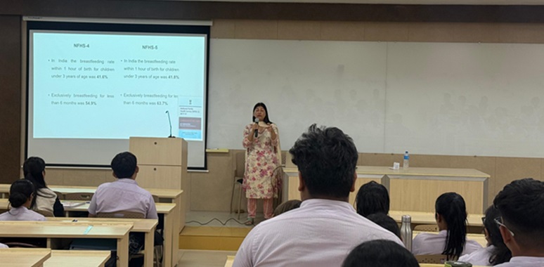 During the session, she highlighted the importance of teaching this technique to young, aspiring nursing students. She emphasized how this cost-effective, non-invasive approach can help mothers and their newborns establish strong bonding, ultimately contributing to improved exclusive breastfeeding rates. This guest lecture was an initiative in alignment with the United Nations’ Sustainable Development Goals- SDG 2 (end hunger, achieve food security and improved nutrition, and promote sustainable agriculture), SDG 3 (ensure healthy lives and promote well-being for all at all ages) and SDG 17 (partnerships for the goals). Overall the aim was to ensure that everyone can lead healthy lives and enjoy well-being, with a special focus on maternal and child health by enhancing breastfeeding practices.