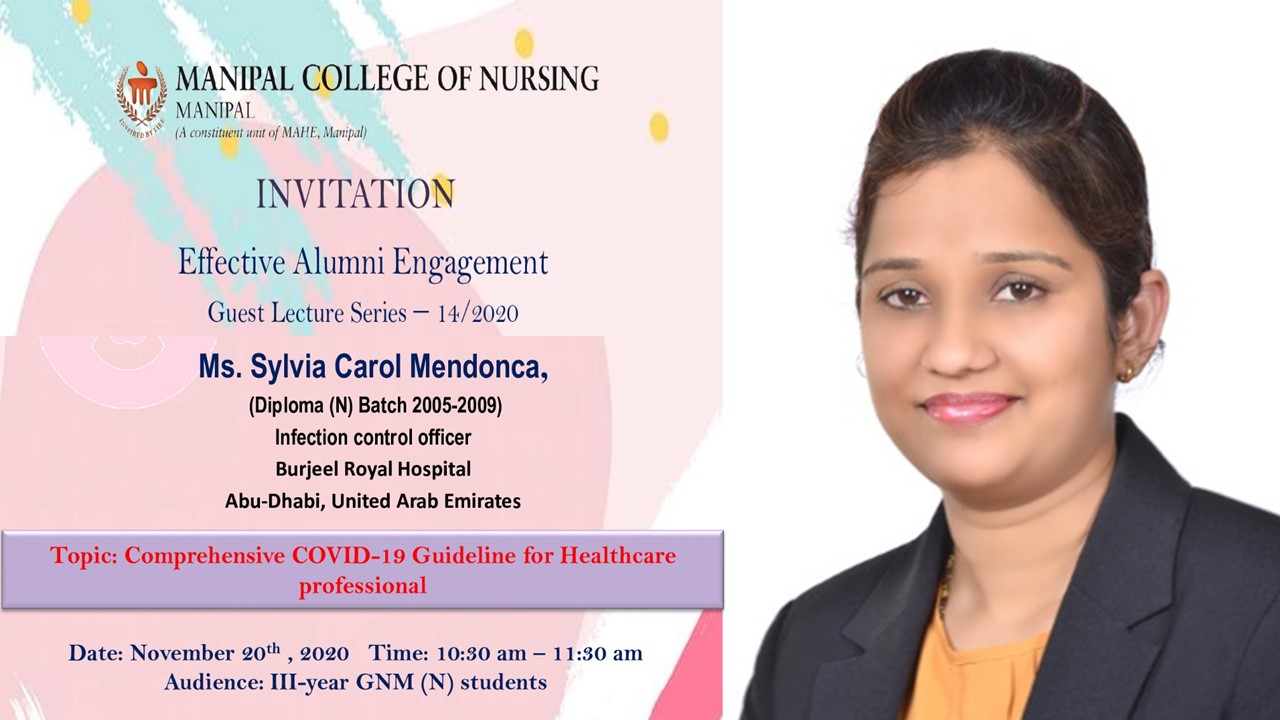 Manipal School of Nursing, MCON, MAHE, Manipal organised a guest lecture by Mrs Sylvia Carol Mendonca (Diploma Nursing batch 2005-09). Infection Control Officer, Burjeel Royal Hospital, Abu – Dhabi, United Arab Emirates as part of effective alumni engagement guest lecture series – 14/2020 on 20th November 2020 from 10.30 – 11.30 a.m. The speaker spoke on the topic “Comprehensive COVID - 19 Guidelines for Healthcare professional”.