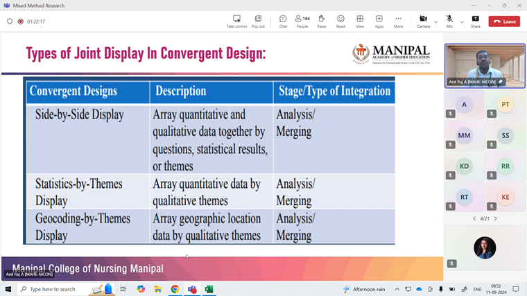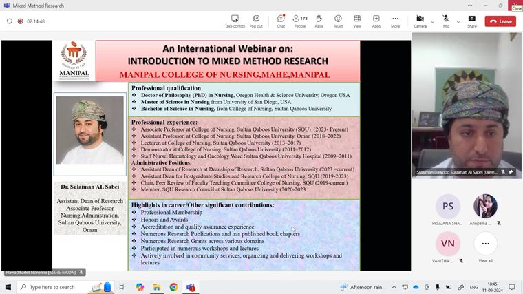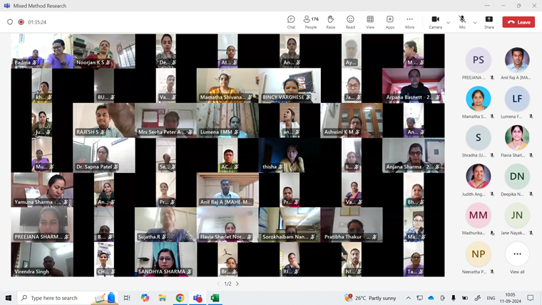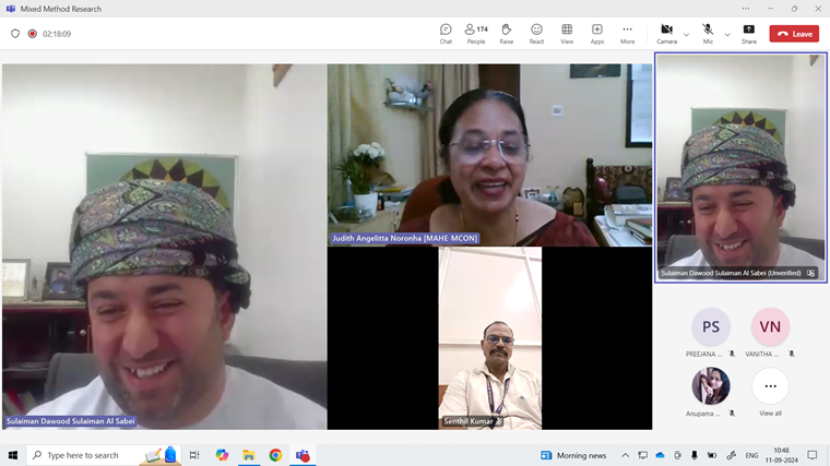 An international webinar was organised on the topic "Introduction to Mixed Method Research (MMR)" by Pillar IV-Alumni Engagement and Relations, Manipal College of Nursing, MAHE, Manipal, on September 11, 2024, between 9.00 am and 12.00 noon. A total of 178 participants (faculty, postgraduate students, and PhD scholars) of nursing, medical, and allied health streams from different parts of the country attended the webinar through the Microsoft Teams platform. The webinar included sessions on topics like an overview of MMR, MMR designs, and analysis of MMR. These sessions were deliberated by Mr Anil Raj, Assistant Professor, Manipal College of Nursing, Dr Anupama D. S., Research Fellow, Dept. of Global Health Governance, Prasanna School of Public Health, MAHE, Manipal; and Dr Sulaiman Al-Sabei, Assistant Dean of Research and Associate Professor, Nursing Administration, Sultan Qaboos University, Oman. The experts gave an overview of the topics with apt examples, making it interesting and interactive for the participants. The webinar was appreciated by the participants and helped to align the goals of Manipal College of Nursing, MAHE towards United Nations SDG #4, "Quality education," by providing an opportunity to its participants for a learning experience. Mrs Flavia S Noronha, Assistant Professor, MCON, welcomed the gathering, Ms. Preejana and Ms. Anjana Sharma, PhD scholars at MCON coordinated the webinar with the guidance of Dr Mamatha S Pai, Professor and Pillar IV Head, MCON.