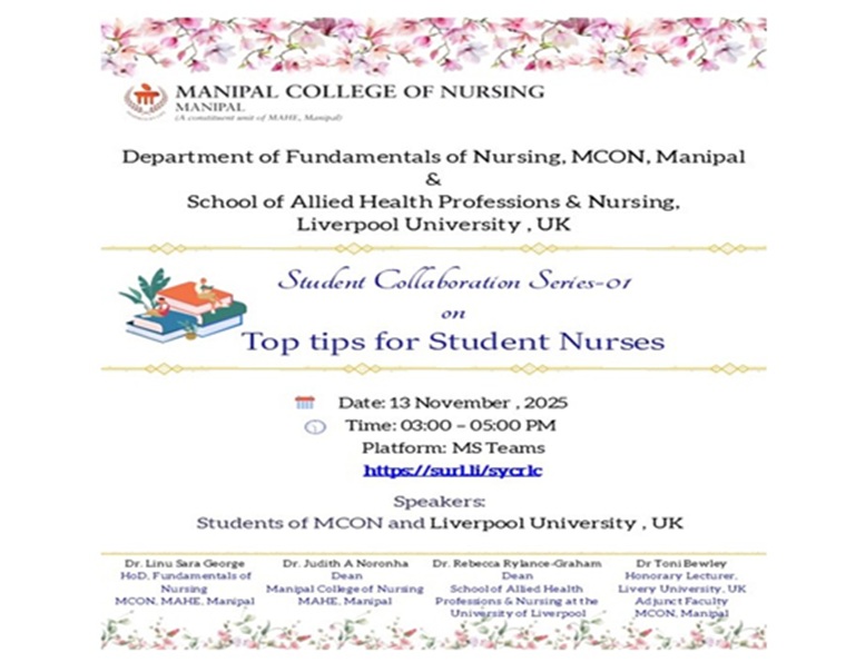 The Department of Fundamentals of Nursing, Manipal College of Nursing (MCON), organized a session titled “Top Tips for Student Nurses” on 13th November 2025, from 03:00 PM to 05:00 PM, via the Microsoft Teams virtual platform as part of the Student Collaboration Activity Series.