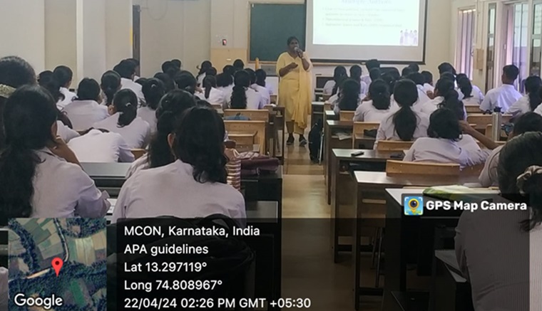 Pillar II, Exemplary Research and Innovation, along with the Department of Fundamentals of Nursing, Manipal College of Nursing, MAHE, organized a session on APA referencing (citing and references) for the II Semester students on April 22, 2024. The session was organized to introduce the students to the topic of APA referencing, its uses, and how they can incorporate the style in writing assignments.