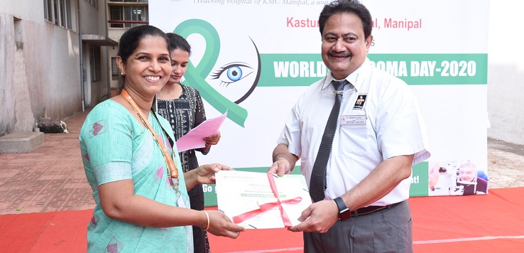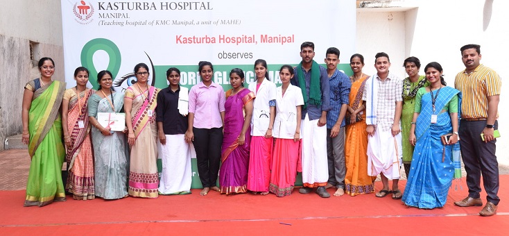 World Glaucoma Day 2020 is observed on 9th March 2020 by Dept. of Ophthalmology, KMC & Kasturba Hospital, MAHE Manipal in association with Manipal School of Nursing. Dr. Narayan Sabhahit, Registrar, MAHE Manipal, was the chief guest for the program and welcome address was given by Dr. Avinash Shetty, Medical Superintendent, Kasturba Hospital, Manipal. The chief guest emphasized the importance of screening tests after 40 years, which may help in the early diagnosis of non-communicable diseases. Dr. Neetha, KIR, Asst. Professor Kasturba Hospital gave an overview of World Glaucoma Week. Glaucoma is asymptomatic, and it will cause irreversible damage to the eye and eventually cause blindness. Dr. Sulatha Bhandary, Prof. and HoD, Dept. of Opthalmology proposed vote of thanks. Students of Manipal School of Nursing played street play on awareness of Glaucoma. Screening for Glaucoma was arranged in the entrance of Smt Sharada Madhav Pai OPD block, KH, Manipal.
