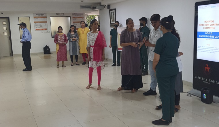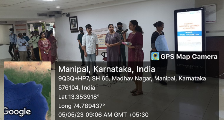 A roleplay spreading awareness on the importance of hand hygiene along with a dance on hand hygiene steps was done by the students of the second semester to create awareness among the patient and patient attendees in the three Outpatient department areas (Main OPD Block, Shirdi Saibaba Cancer Center, Women, and Child Block) of the Kasturba Hospital Manipal. At the end of the program, a pocket card with hand washing steps from WHO was distributed among them. There was a good response from the viewers, and some actively came forward to demonstrate the same.