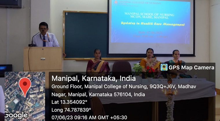 Manipal School of Nursing, MCON, MAHE, Manipal organized a seminar on ‘Updates in Health Care Management’ on June 7th, 2023 from 9.00 am to 1.00 pm for final year GNM nursing students. The chief guest of the program was Dr. Ullas Kamath, Dean, MMMC, MAHE, Manipal. Dr. Leena Sequira, Principal, MSON, MCON, MAHE, Manipal introduced the chief guest and welcomed the gathering. Dr.Judith A Noronha, Dean, MCON, Manipal addressed the participants with her motivational words and encouraged them to be better caregivers as well as to perceive higher education. The first session was on the Nurse's role in the administration of medication by Mrs. Sheela Shetty, Assistant Professor (Sr.scale), MCON, MAHE, Manipal. She discussed on principles and routes of drug administration and also stressed medication errors and how to prevent errors while administering medications.