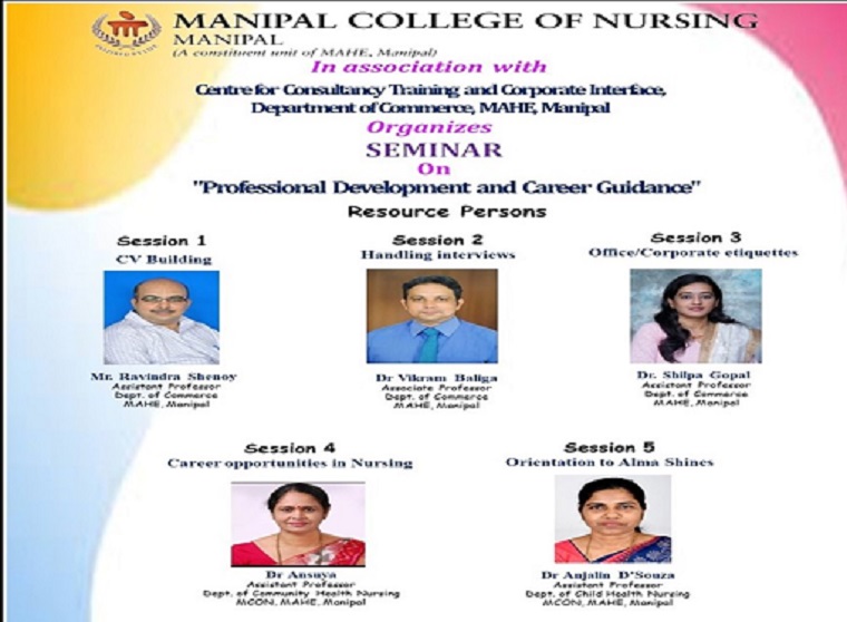 Manipal College of Nursing Manipal in association with the Centre for Consultancy Training and Corporate Interface (CCTCI), Department of Commerce (DOC), MAHE, Manipal organized a seminar on Professional Development and Career guidance on June 1st, 2023 from 9.00 am to 1.00 pm for final year BSc nursing students. The first session was on CV building by Mr.Ravindra Shenoy, Assistant Professor, DOC, MAHE, Manipal. He gave a clear idea on the method of preparation of a CV for nursing students and emphasized that a CV should be prepared based on the job description. Dr.Vikram Baliga, Associate Professor, DOC and Head of CCTCI MAHE, Manipal spoke on ‘How to handle interview’.