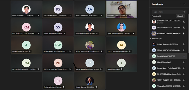 Pillar II Exemplary Research and Innovation, in collaboration with the Student Research Forum of Manipal College of Nursing, MAHE, Manipal, conducted an online session titled “Preparing a Scientific Presentation (Oral & Poster)” on 25th June 2025. The session held from 2:00 p.m. to 3:00 p.m. was led by Dr. Sushmitha Karkada, Associate Professor, Manipal College of Nursing, MAHE, Manipal. She provided an in-depth overview of the essential components of crafting and delivering effective oral and poster scientific presentations.
