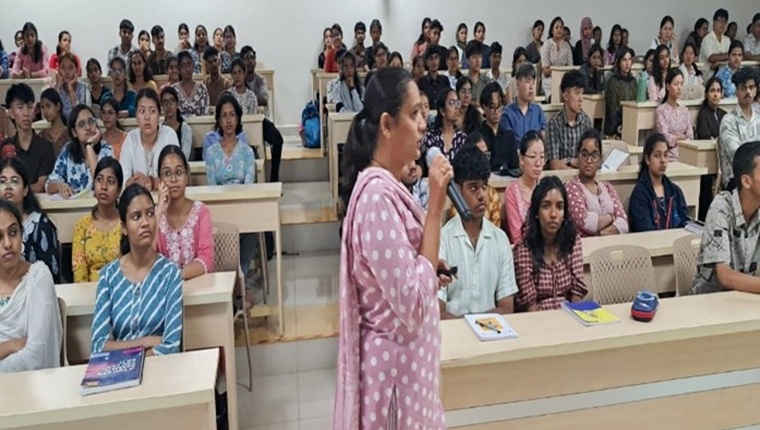 The Community Health Nursing Department organized a guest lecture on “Care and Affection to Patients” for first-semester BSc nursing students on August 5, 2025, from 2.00 to 3.00 pm, led by Ms. Reena D’Silva, Nurse Educator, Kasturba Hospital, Manipal, who emphasized effective communication, empathy, and compassionate care required for patients during their clinical postings. The session is a part of the Deeksharamba orientation program, aimed at inspiring students to uphold SDG: 3 Good health and wellbeing in their practice.